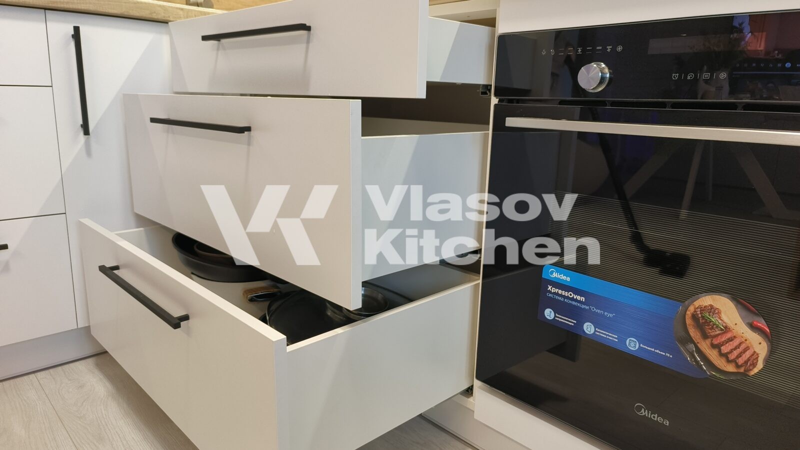 — Фасады выполнены из высококачественного материала Egger Белый альпийский W1100 ST9 — экологически чистый материал, устойчивый к механическим повреждениям и влаге.