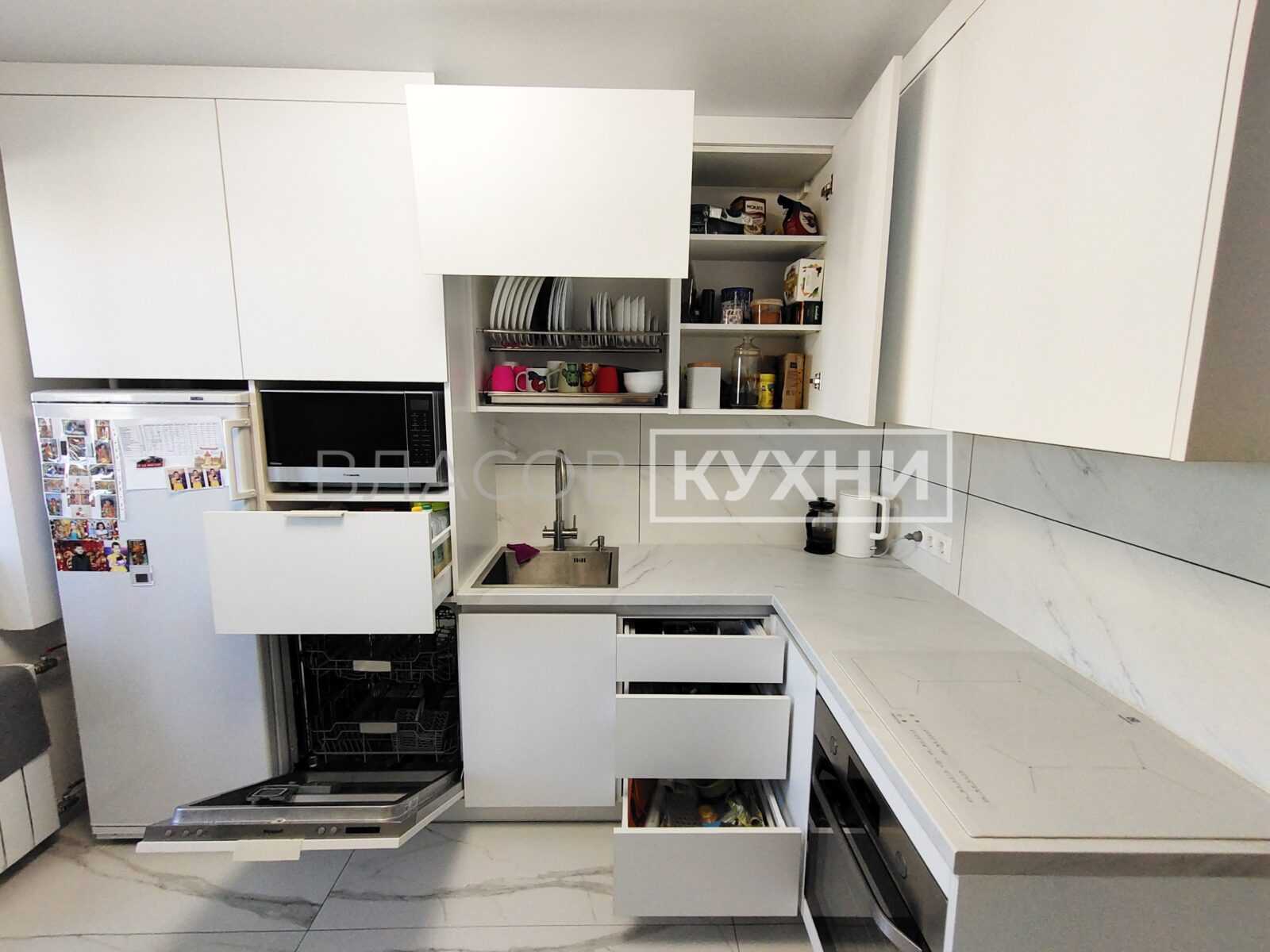Основное пожелание заказчика, было вместить всю встраиваемую технику на небольшое пространство, посудомойку поставили под пенал. Заказать белую кухню в Минске прямо сейчас. Бесплатный выезд дизайнера, высокое фабричное качество, дизайн-проект в подарок.