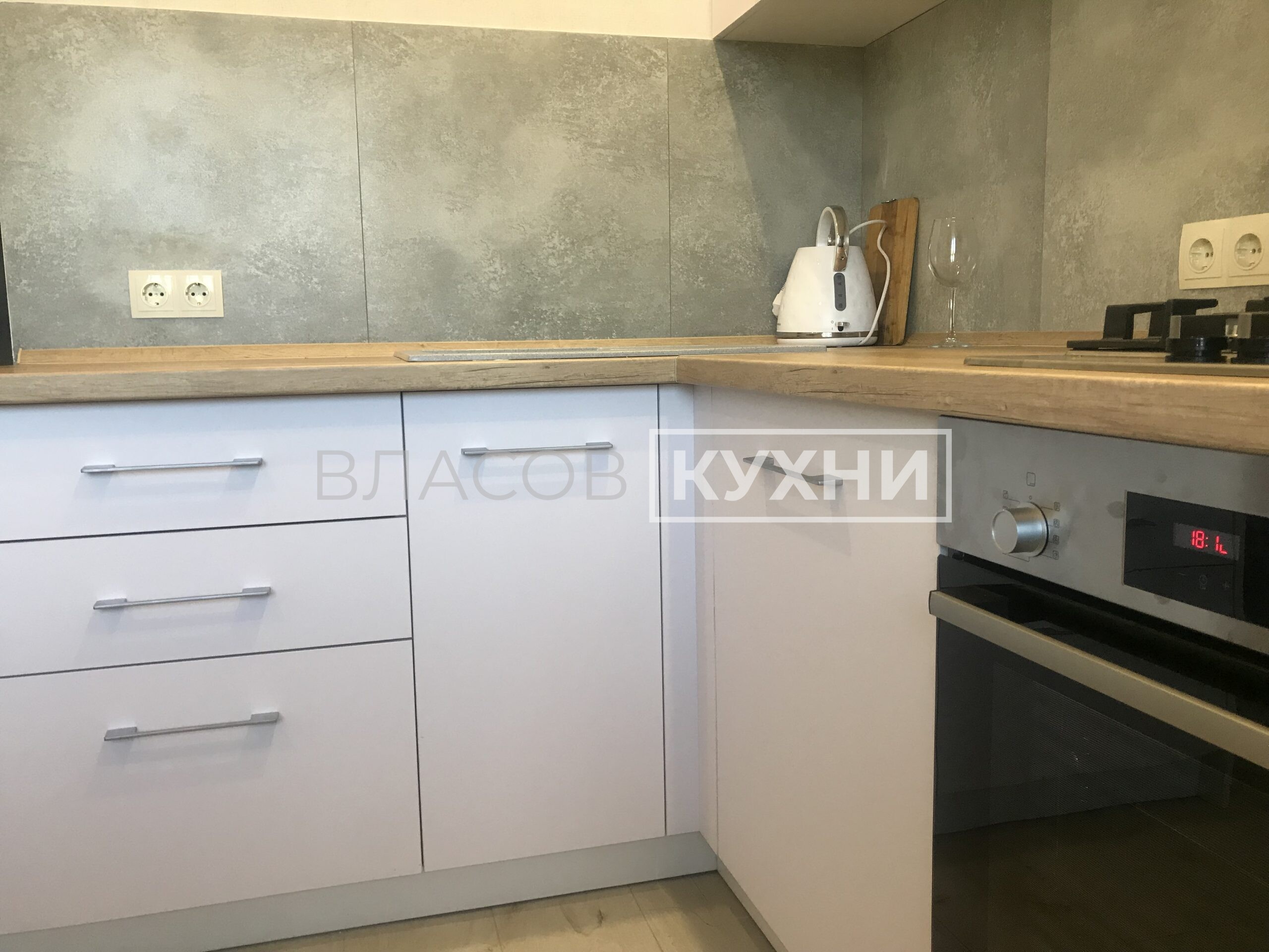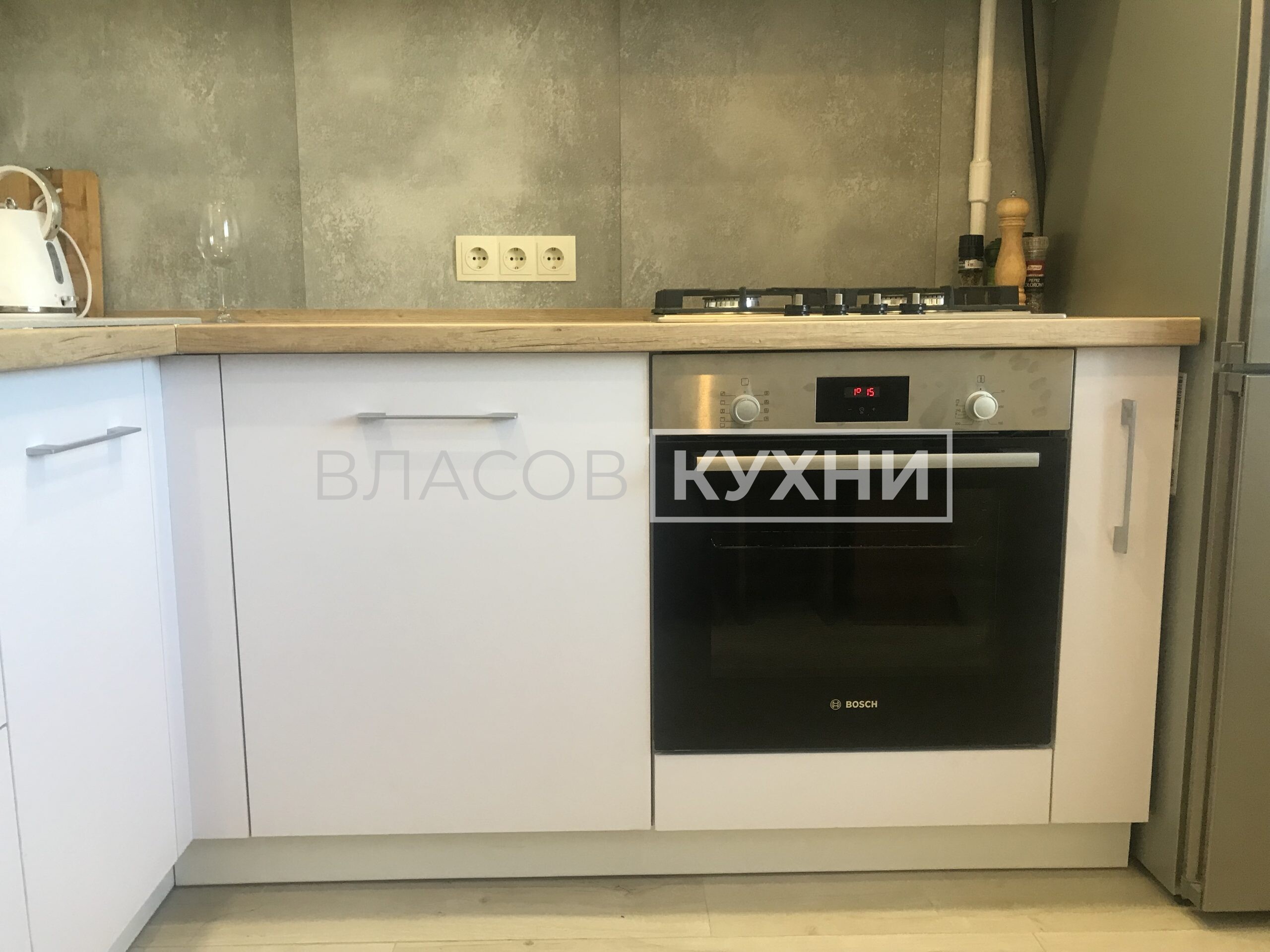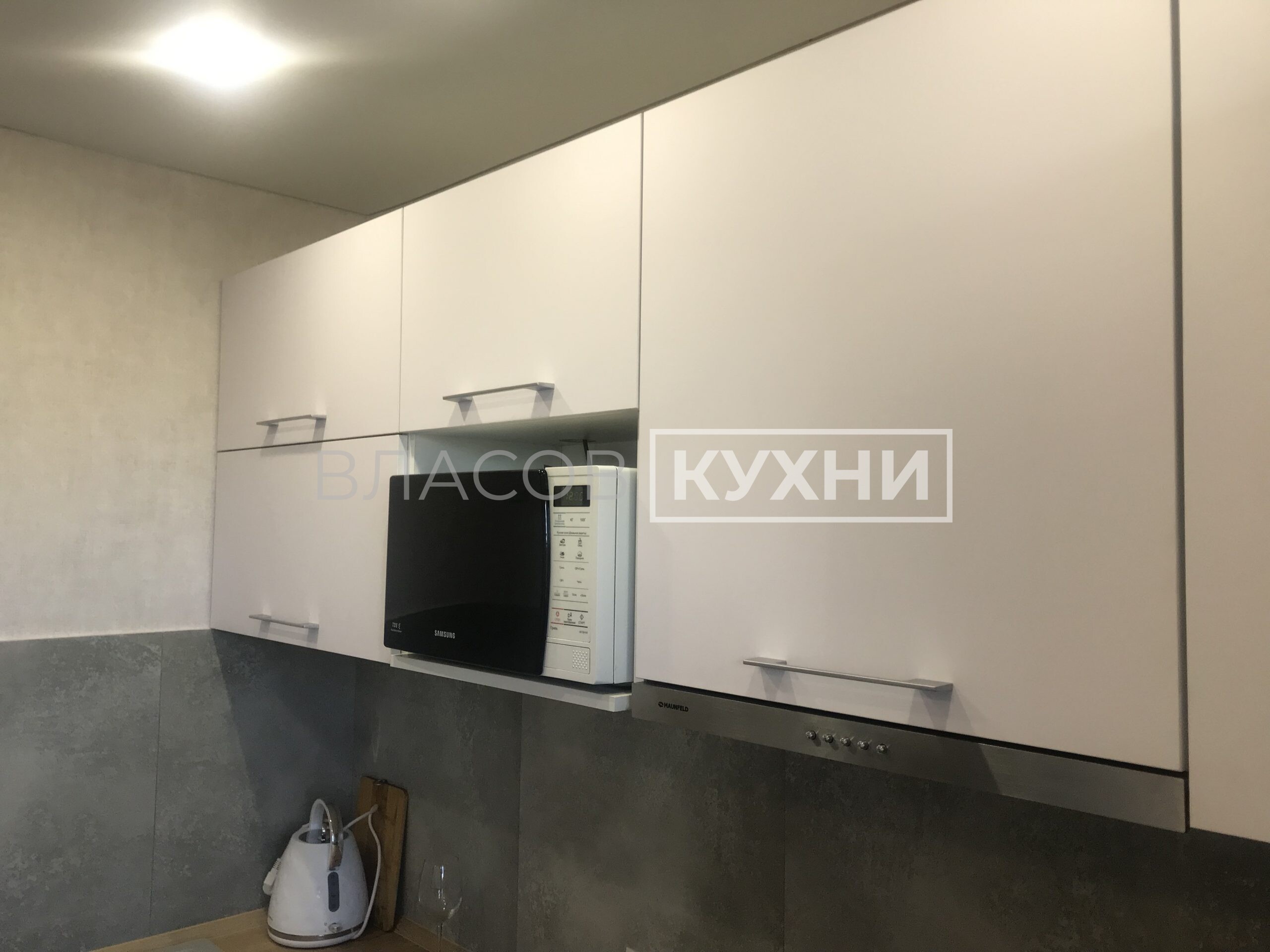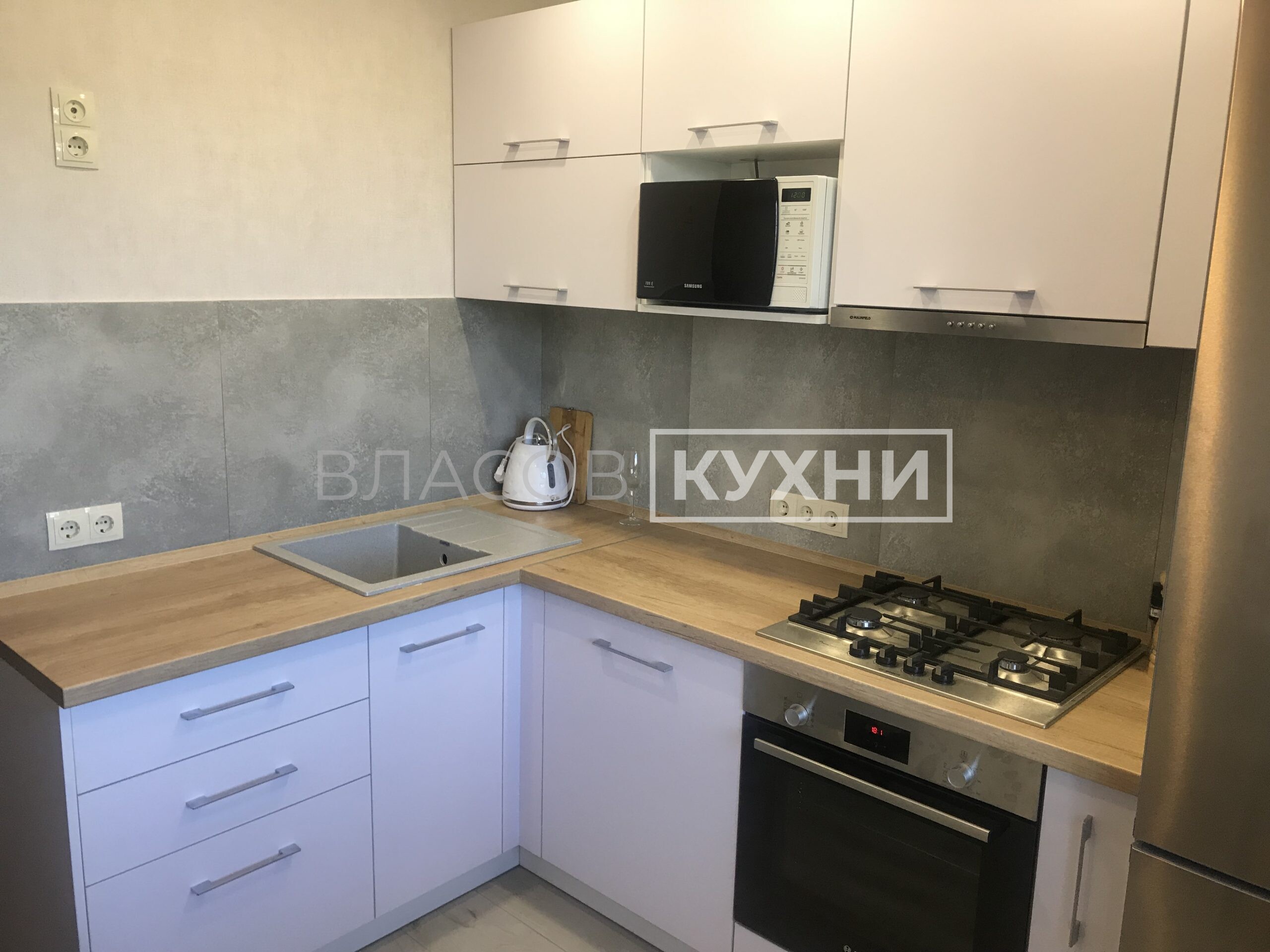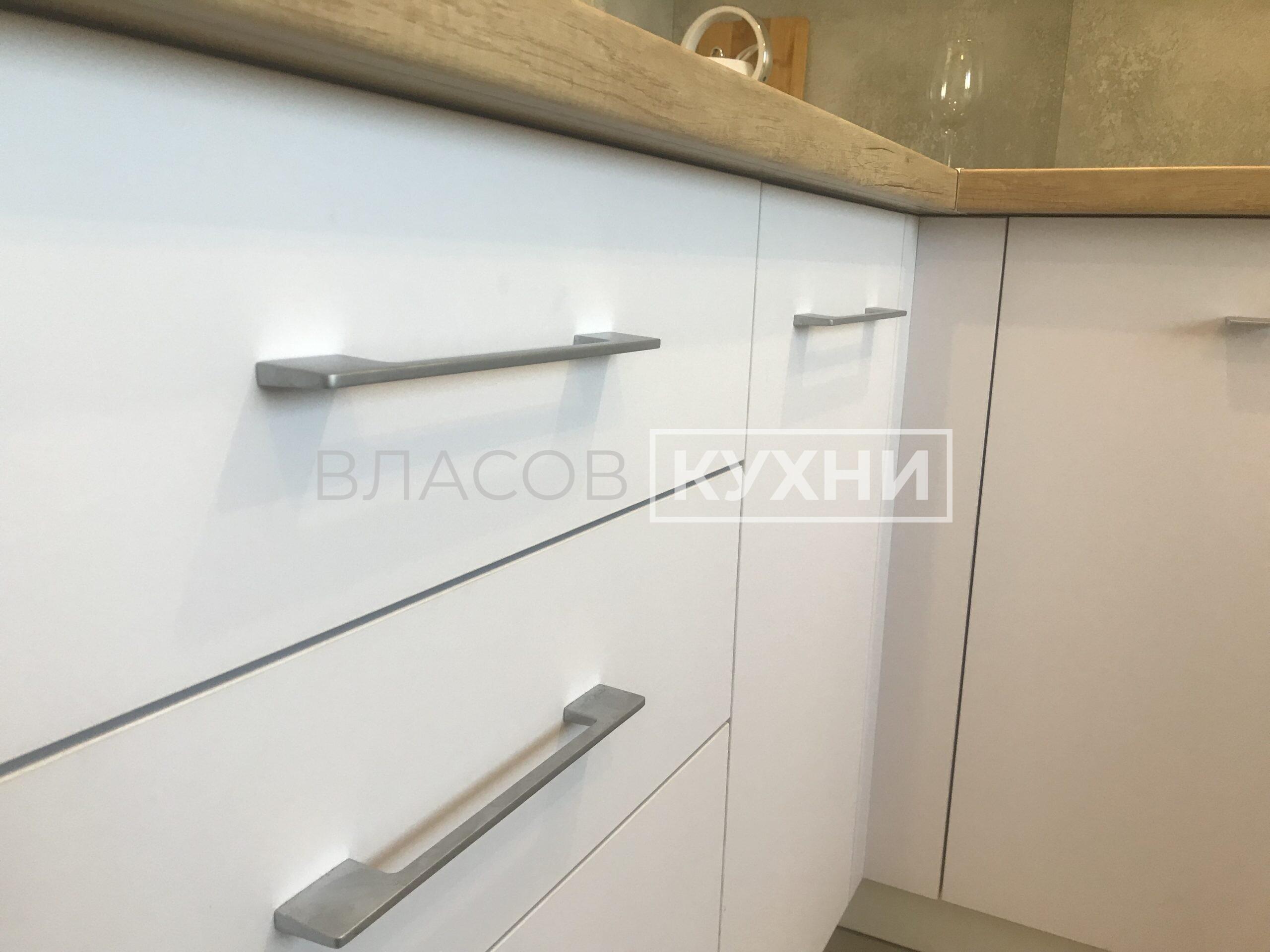 Угловая матовая белая кухня в Минске с фасадами Fenix.