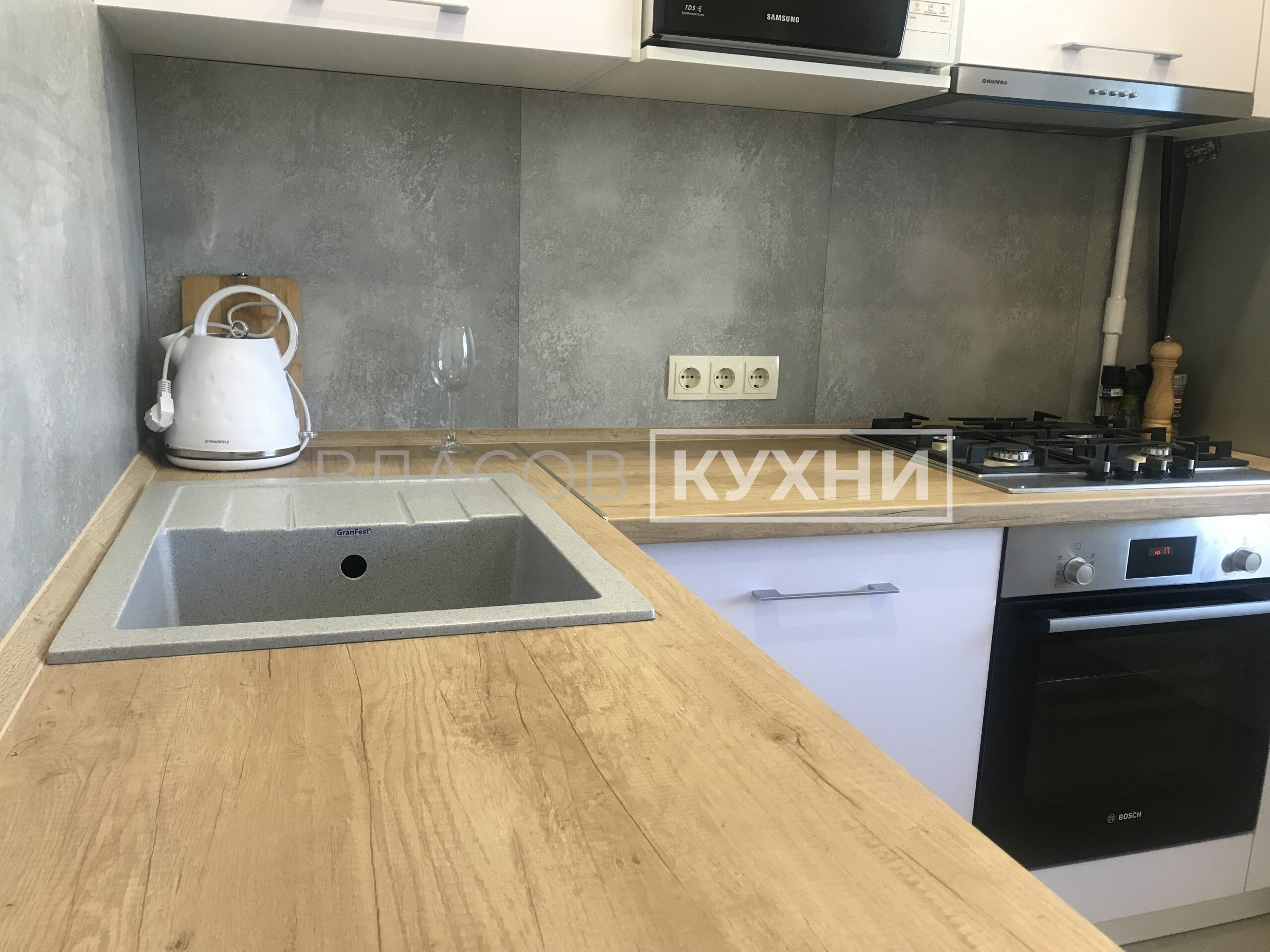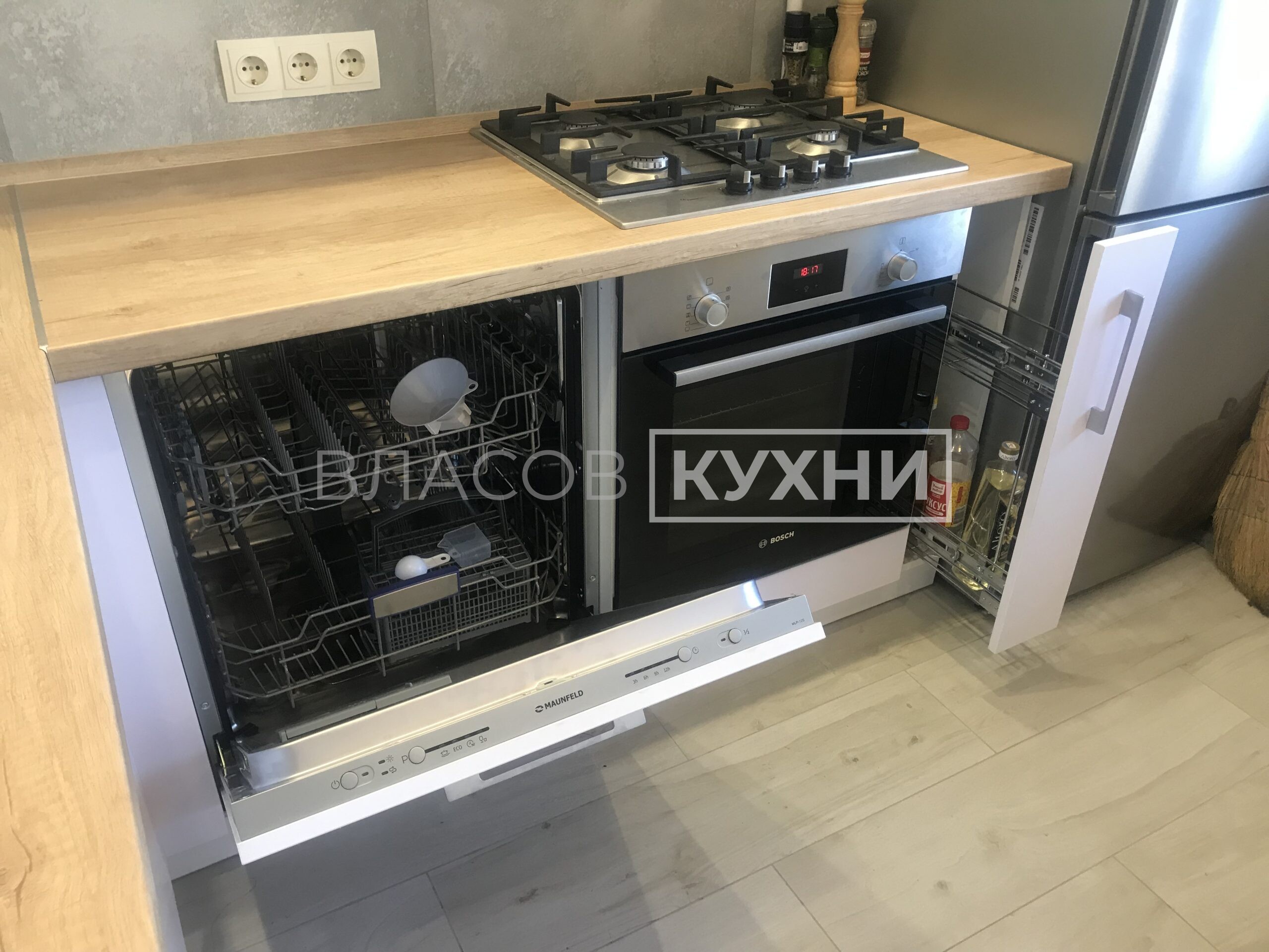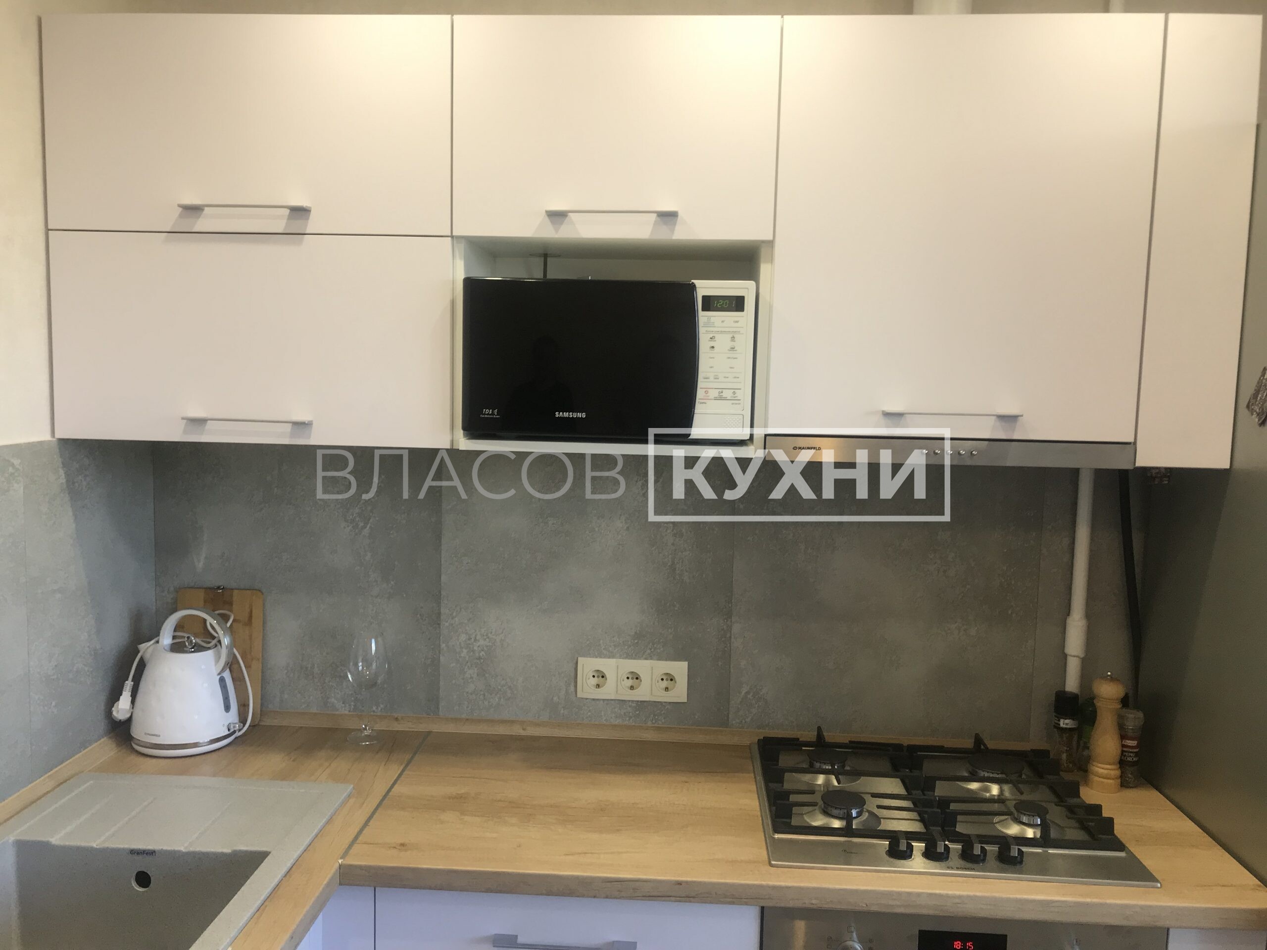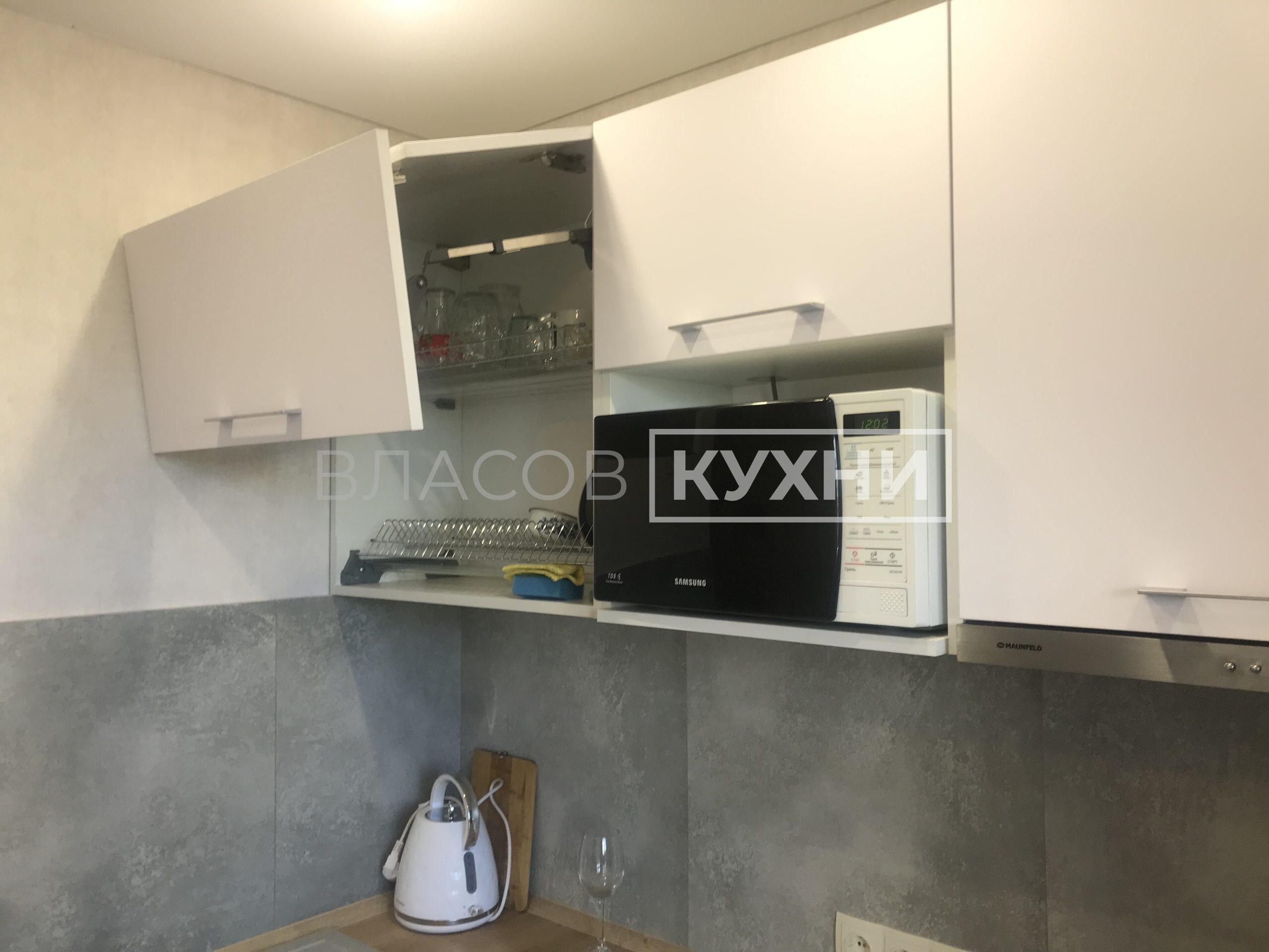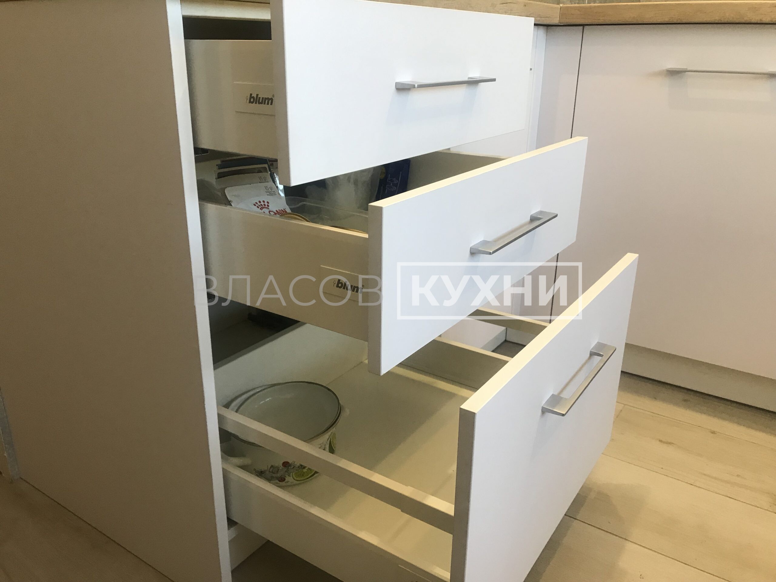 Фурнитура: Antaro Blum (цвет белый шёлк), Aventos HF, Aventos HK-XS, карго Boyard.