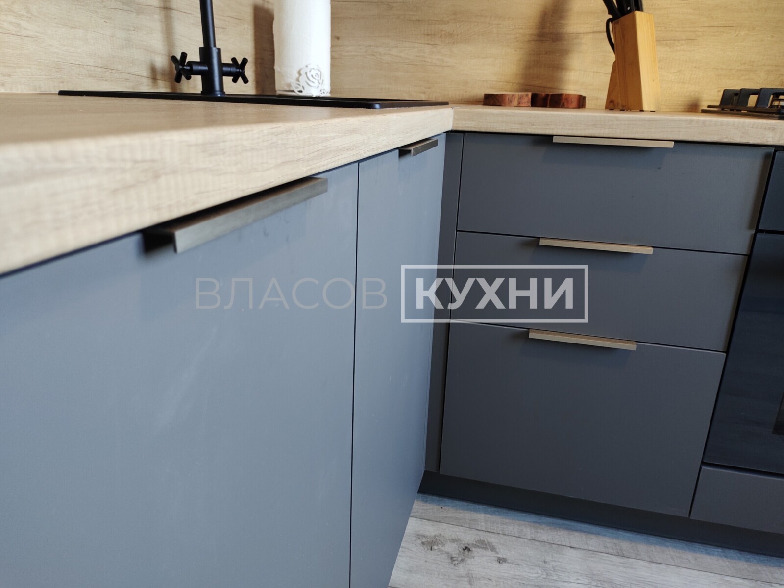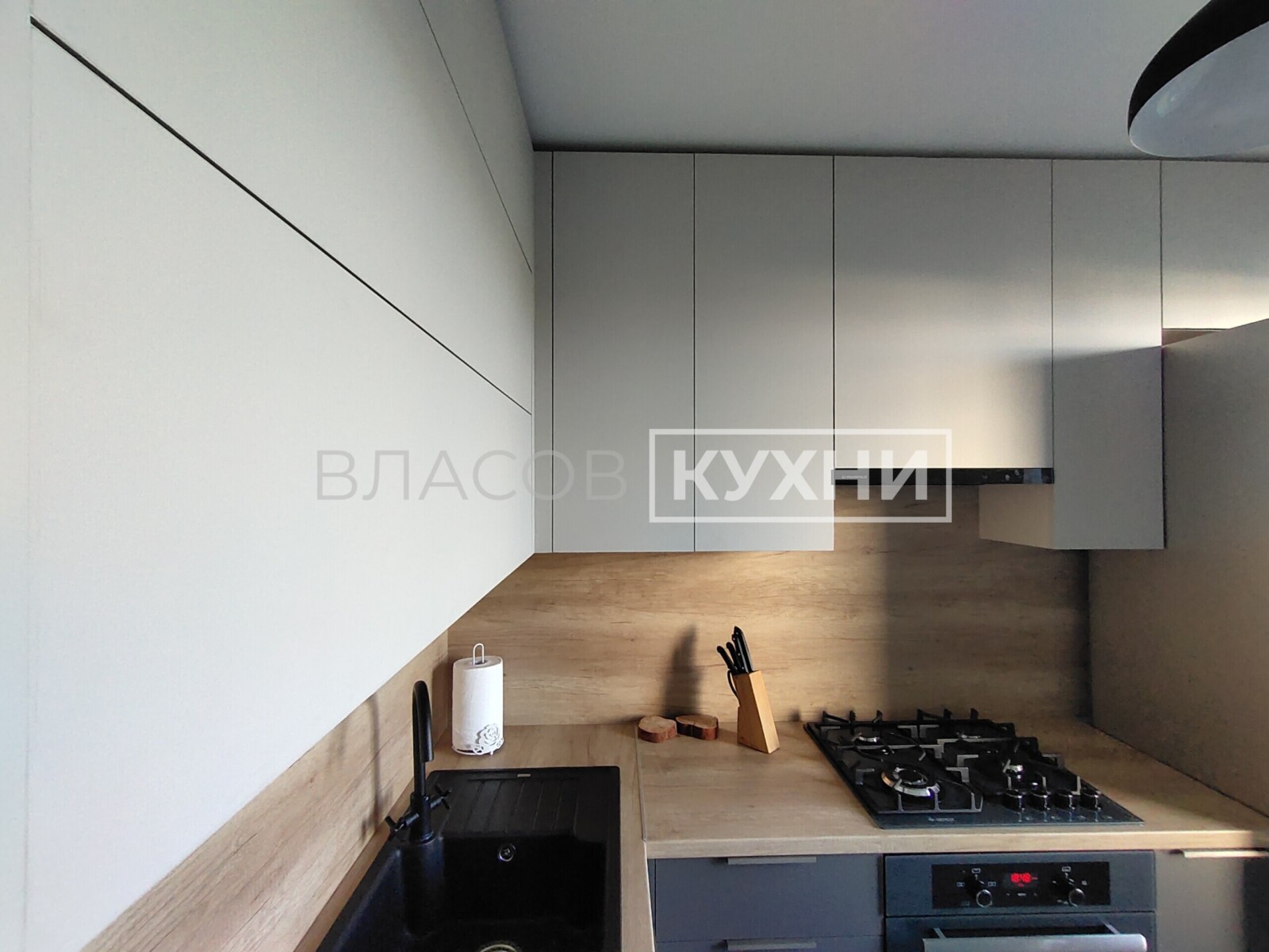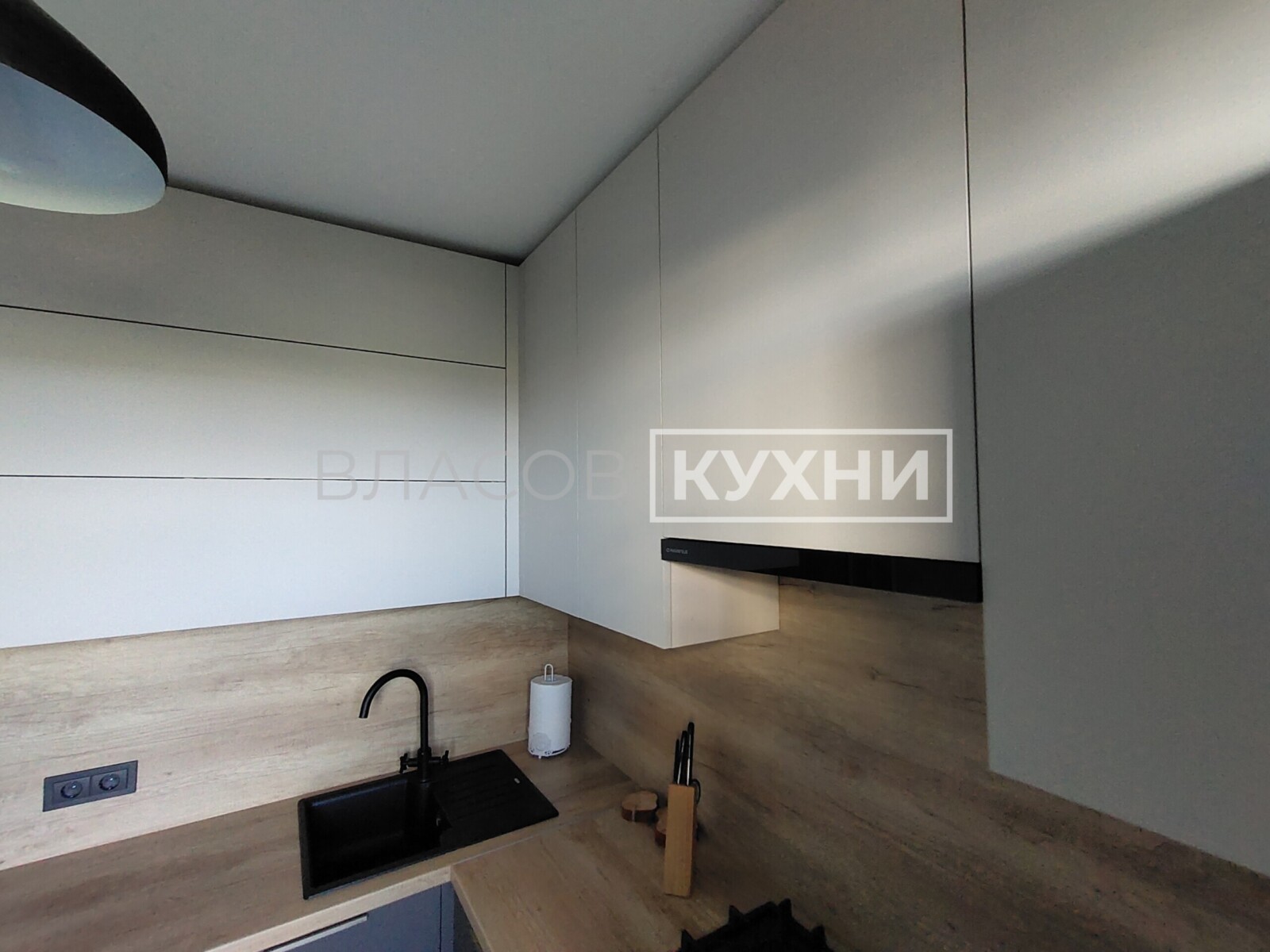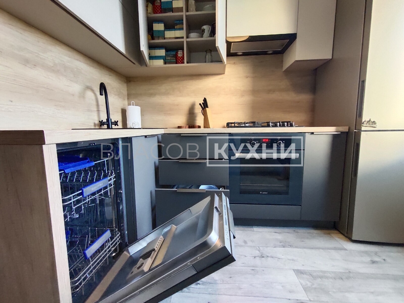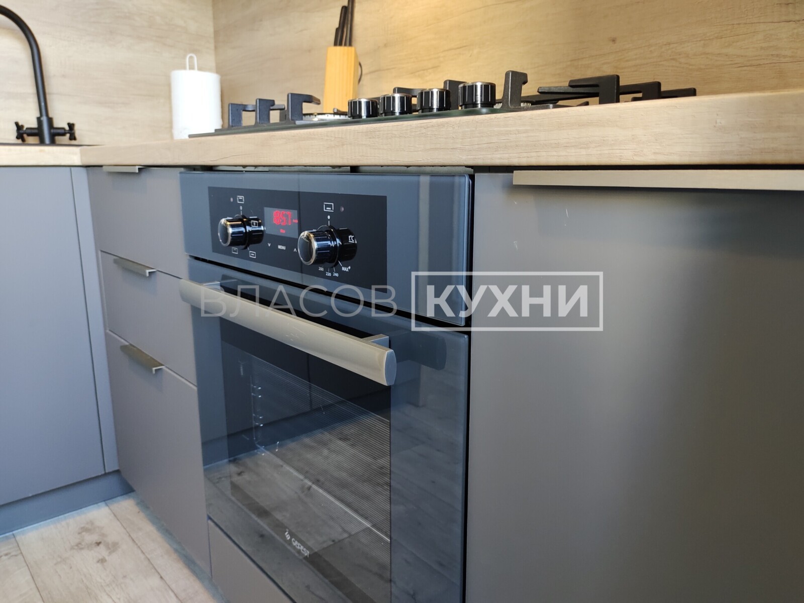 — Фасады шкафов: изготовлены из коллекции AGT Supramat с гладкой поверхностью, цвета 3019 Sahara Cream и 3022 Royal Grey придают кухне современный и утонченный вид.