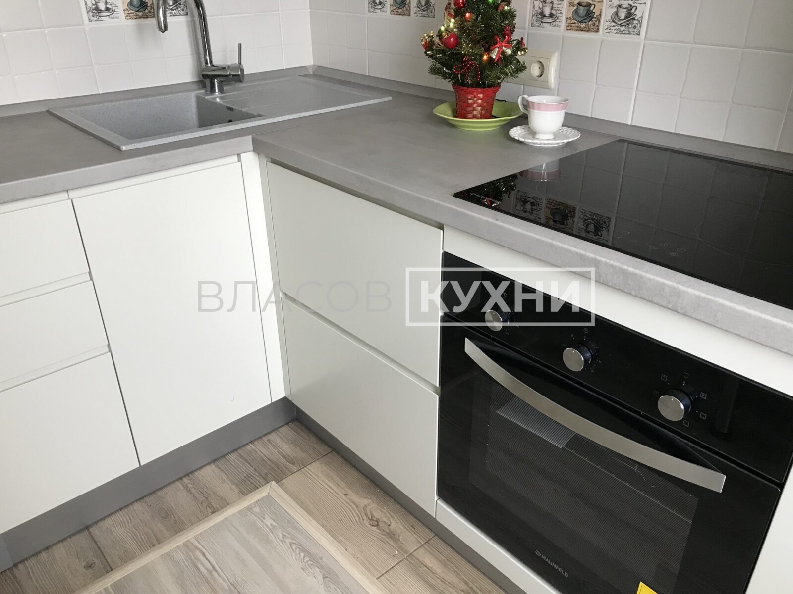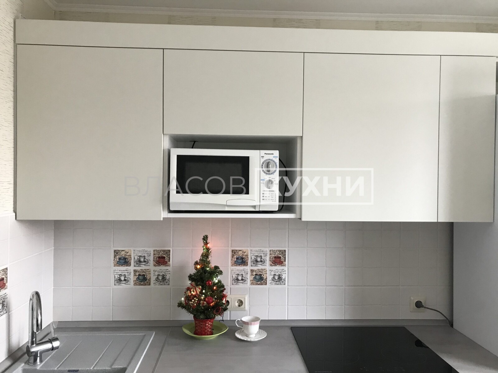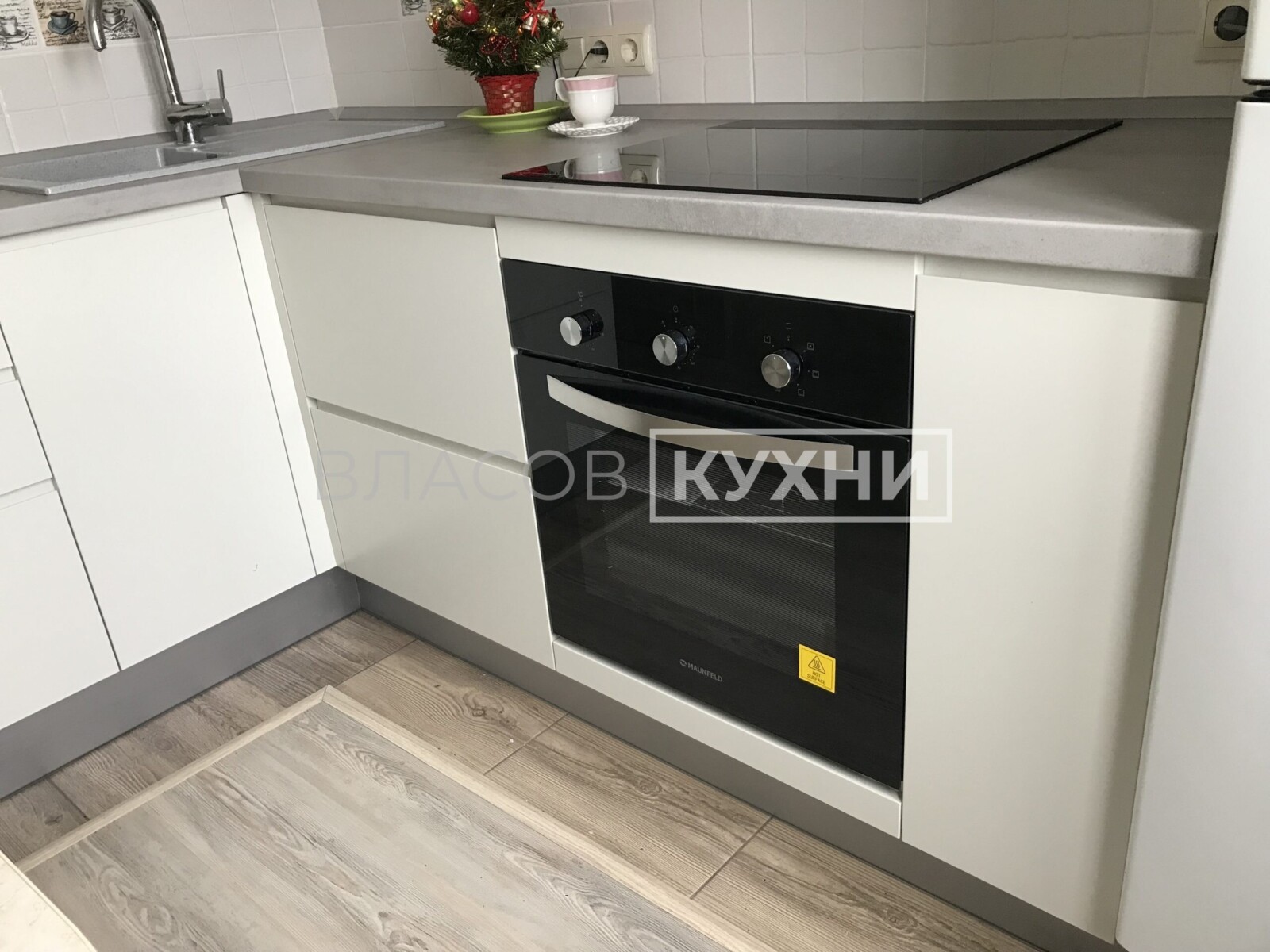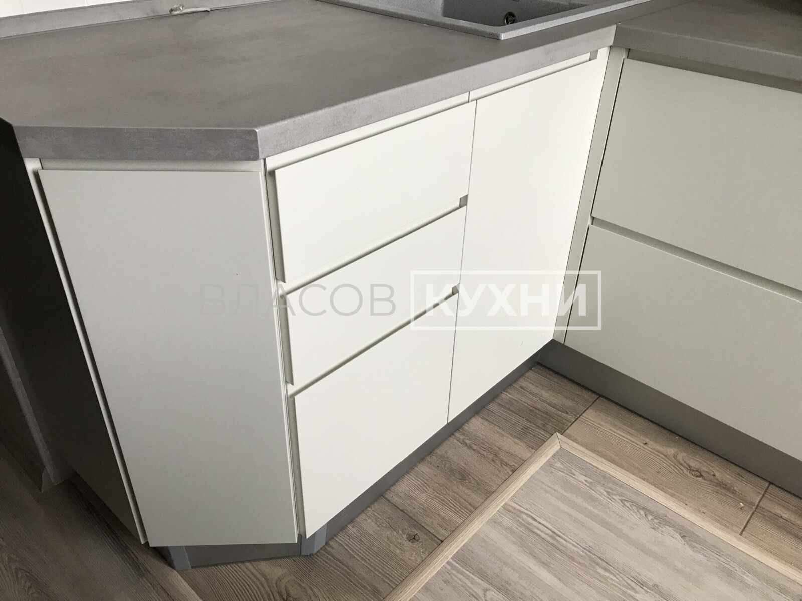 Кухня в светлых тонах из крашеного МДФ с интегрированной ручкой.
