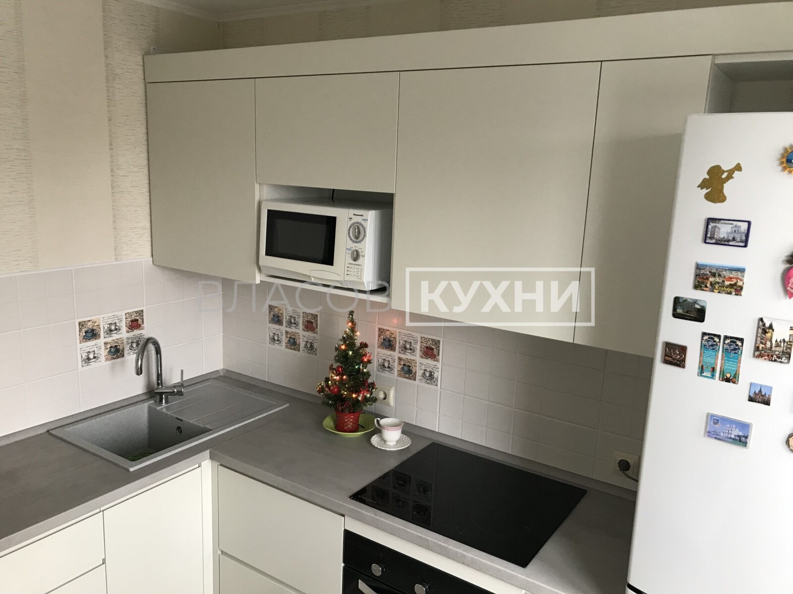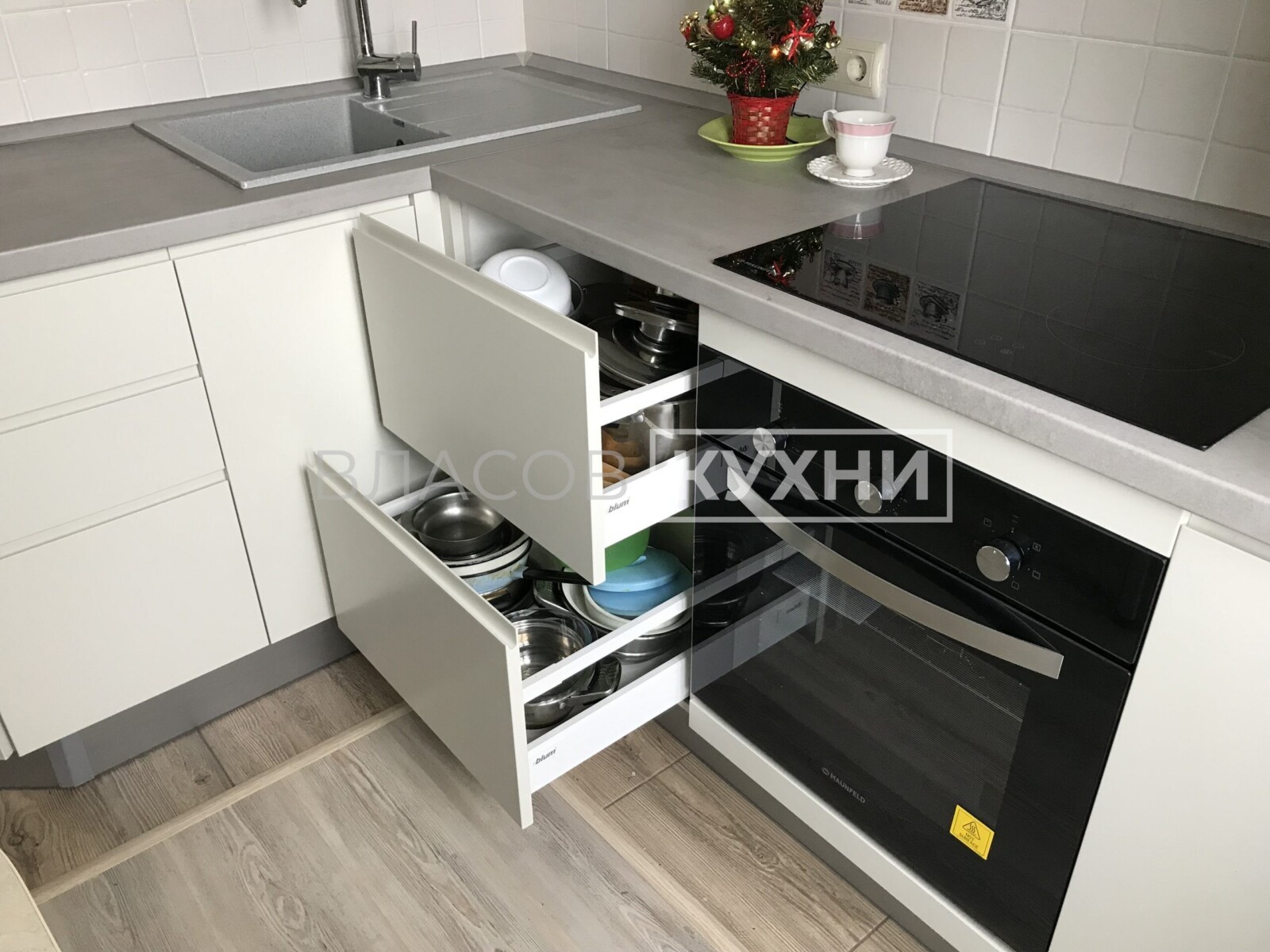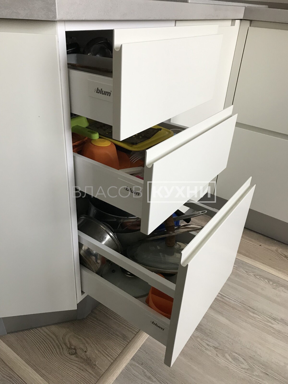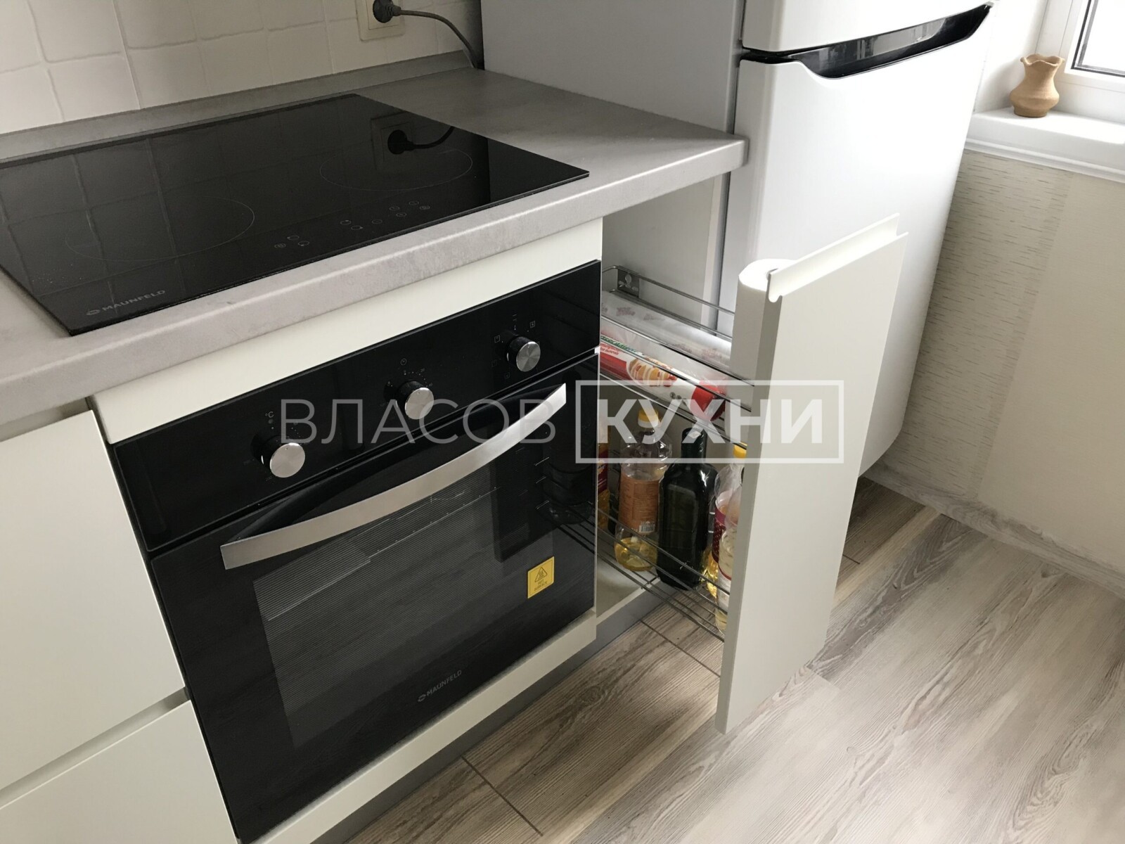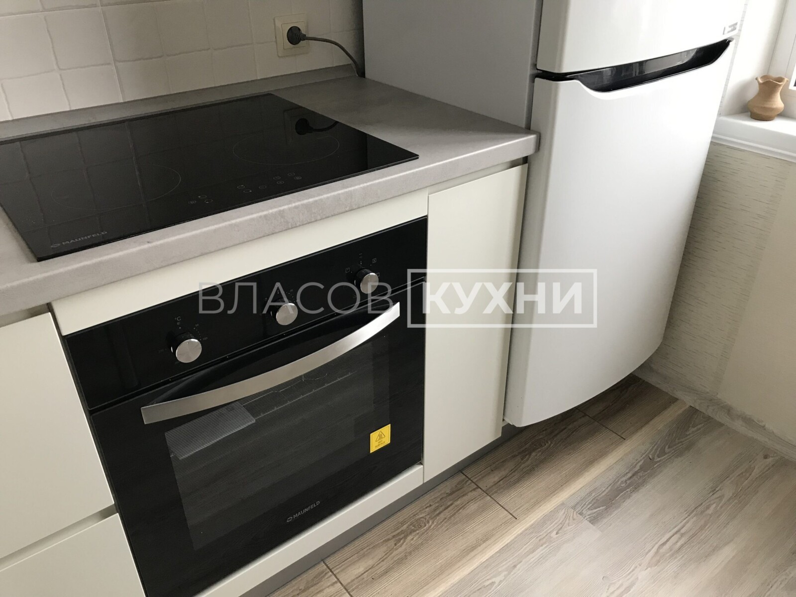 Кухня в светлых тонах из крашеного МДФ с интегрированной ручкой.