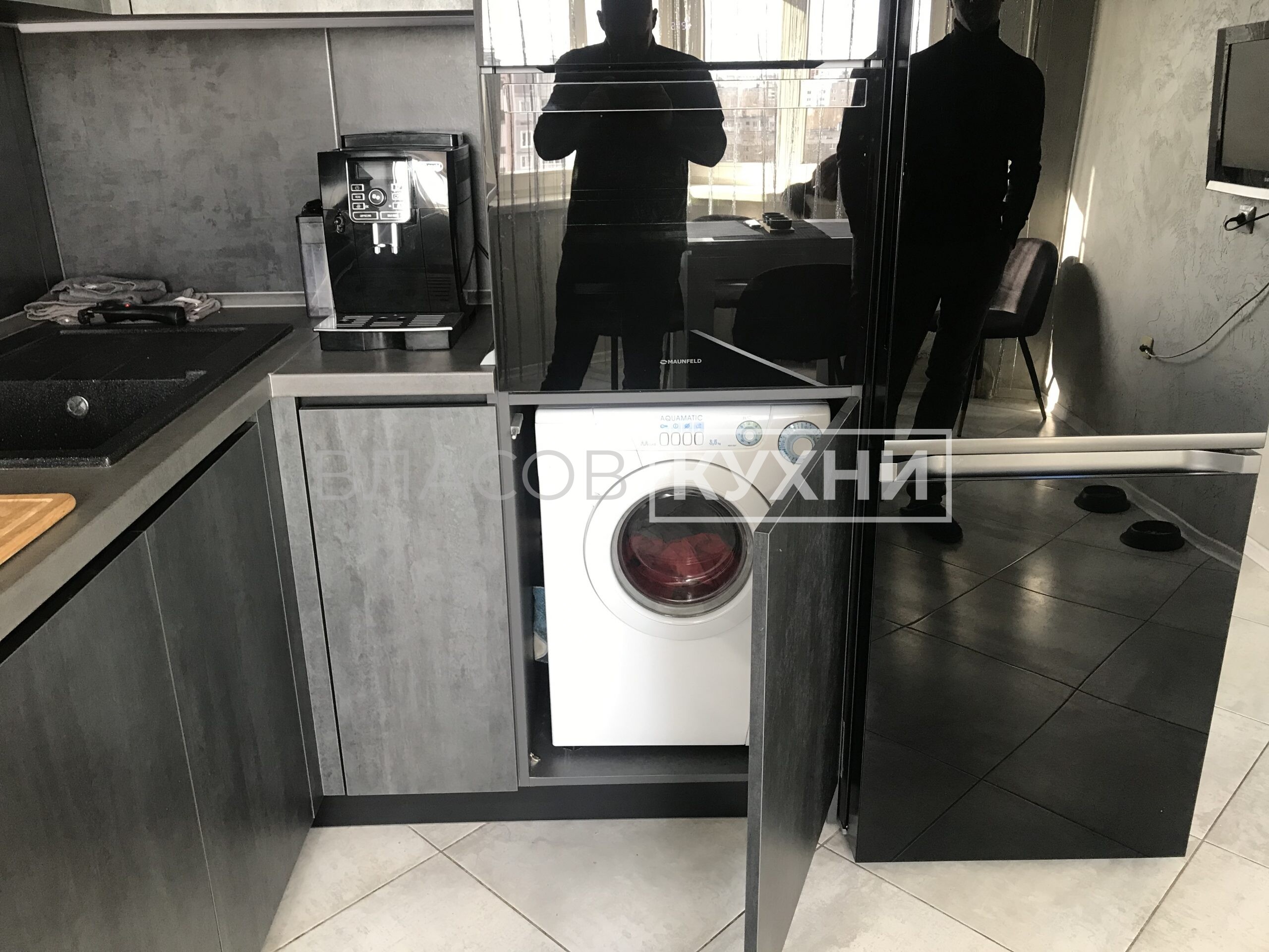 ▫️В тандеме с нашими заказчиками, получилась смелая, необычная, современная и модная Кухня в стиле Лофт. Вместили много встраиваемой техники, в том числе и отдельно стоящую стиральную машину под духовым шкафом. Отказались от стандартных ручек и поставили скрытый итальянский профиль Opes чёрного цвета.