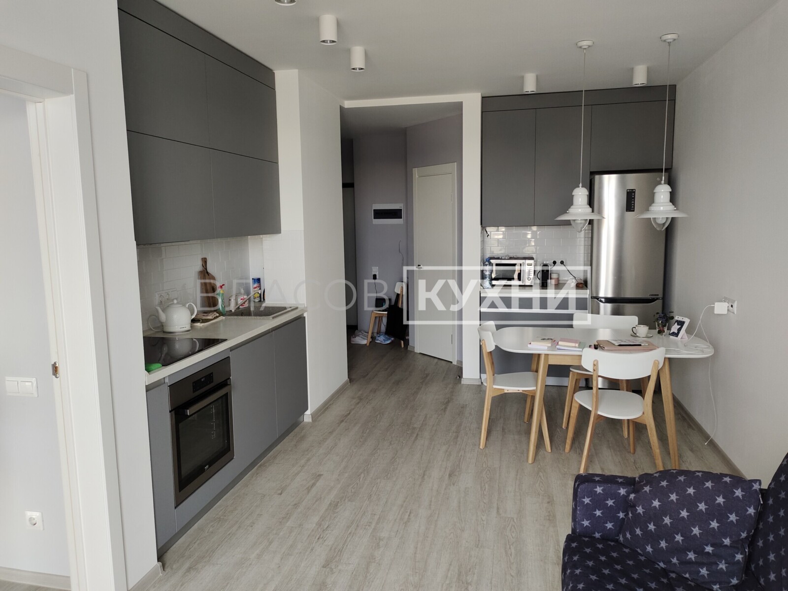 Стильный вариант кухни, совмещённой с гостиной в Маяке Минска для IT-специалиста Александра.